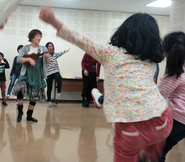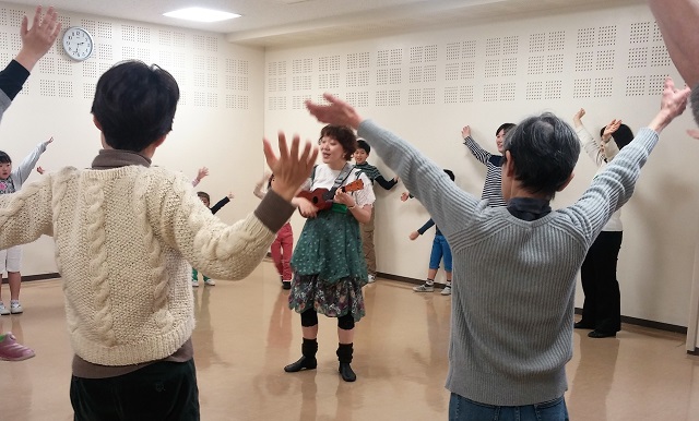 編み出されたのは、片足を上げたポーズ2種類、腿上げ、アキレス腱伸ばし、最後は深呼吸という動き。リズムをつけながらこの動きをみんなでやるうち、なっちゃんがウクレレを弾きながらリズムに合わせて「ゆきやこんこん」を歌い出した。あらあら、なんだかミュージカルっぽくなってきた?