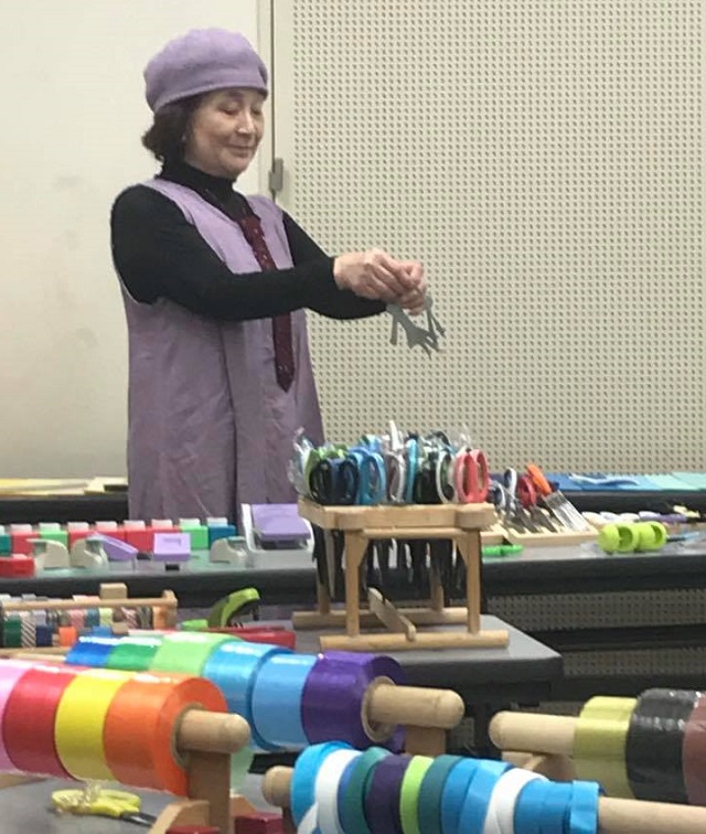 大勢の参加者とたくさんの材料。いろとりどりのラシャ紙、紙やビニールテープ、紐、封筒、ガムテープなどが並ぶ。同じ青でも5種類はある。