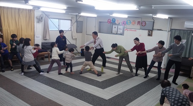 「みんなうまく跳べたかな?次はあやとびをやってみましょう」「次は二重跳び」「三重跳びはできるかな」と、跳ぶ回数を増やしていくと、だんだん参加者ものってきて、果ては「十重跳び」。ふくろこうじさんが「できた人~」と聞くと、「はーい」とみんな。