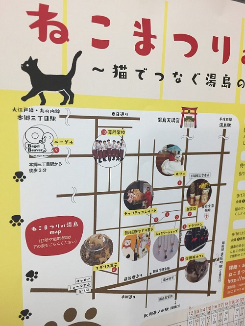 みなさん、湯島って文京区なんですよ!知ってましたか?湯島が文京区から削られている地図をみて衝撃を受けたことがある湯島在住の竹形です。なにしろ、その文京区の地図には谷中が入っていましてね(苦笑・以下略)。気を取り直して(えーと、今年は2017年です、念のため)9月12日から10月1日まで湯島方面で「ねこまつり」が開催中。私のお気に入りの店ベーグルビーバーさんが参加されているのでご紹介します。