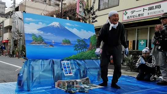 銭湯といえば富士山のペンキ絵。ということを知る人も少なくなっているのではないだろうか。銭湯はいまや絶滅危惧業種となりつつあり、東京都内では10年前の837軒から508軒へと激減中で(東京の公衆浴場の現況)、文京区内で残っているのはわずか6軒。失われゆく銭湯が地域で果たしてきた役割を見直し、記録や保存の活動をしている文京建築会ユースがこのほど、文京区根津の藍染大通りで、ペンキ絵師丸山清人さんと、庶民文化研究家の町田忍さんを招いて「東京の銭湯とペンキ絵ライブ」を開いた。銭湯に描くペンキ絵の小さい版を、路上で絵師がライブで描いていくというもの。通りがかりの人も鮮やかな富士山の絵に目を見張っていた。