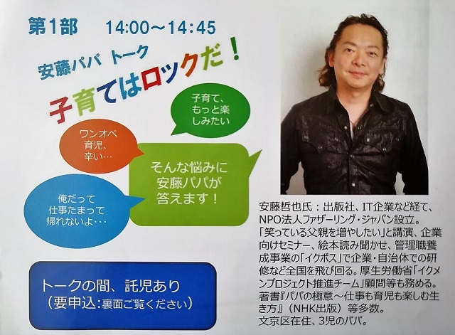 「子育てはロックだ!」と常々口にしているNPO法人ファザーリング・ジャパン代表の安藤哲也さんのトーク&絵本ライブのイベントが8日(月祝)14時から、小石川図書館4階ホールで開かれる。無料で、託児もある。