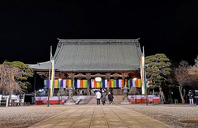 まずは「仁王門」。ここをくぐると境内に入る。年末年始らしく周囲には屋台が並んでいる。焼きそば、お好み焼き、くじ引きなど。深夜だが子どもたちの姿がみえる。今夜は特別だ。