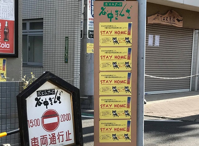 世界的な観光地となった谷中銀座には、かわいらしい「STAY HOME」の掲示が登場した。