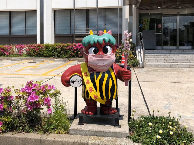 まちを歩いていて、明らかにかつてと変わったのは、ほぼ全員がマスクを着けていることだ。ハチ公も着けているらしいし、南千住警察署前の鬼のキャラクターもマスクを着けている。