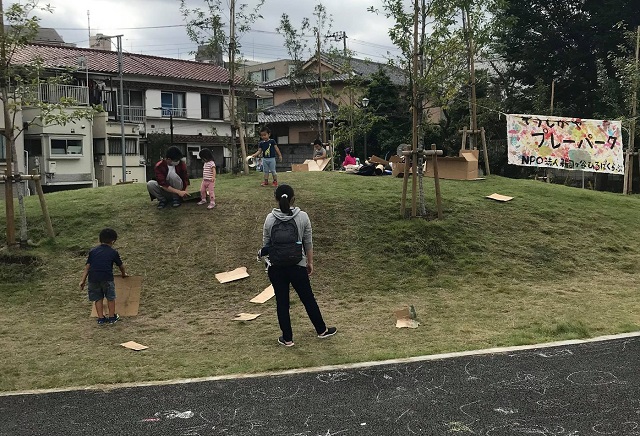 その朝。広々とした芝生の公園の上に、青空が広がり、遠くに池袋のビル群がくっきり見える。公園内では広々とした芝生の上で、子どもたちが思い思いに遊んでいる。ベーゴマで遊ぶ子、テントを組み立てている子、小山で土手滑りに興じる子、大きなシャボン玉づくりに挑戦している子、芝生に座って紙芝居に見入る子。何もせず、芝生に寝転んで空を見ている親子さまざま、特に決まったプログラムはなく、なんでもありの空間のようだ。一緒に遊ぶ大人もいれば、子どもたちが遊ぶ様子を楽しげに見ている大人もいる。