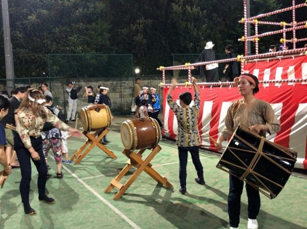 夕方からは境内で手持ち花火、淑徳学園の校庭ではビンゴ大会が開催され、その後盆踊り。盆踊りは事前の練習会などもあり、2段組のやぐらや和太鼓などの演出も凝ったものになっていた。音響は早稲田大学放送研究会が担当した。