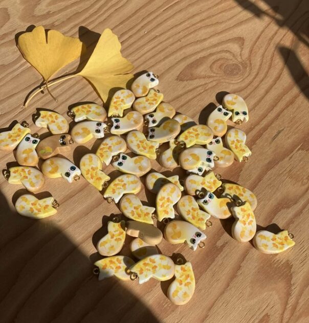 「秋限定カラー いちょう猫あります」。平田製作所の木工細工による猫のチャームも並んでいた。かわいいので思わず手が伸びた。