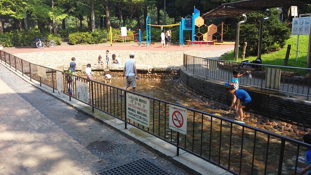 まずは教育の森公園(大塚3-29-2)にあるじゃぶじゃぶ池。水場が2つあり、比較的広い。10時~16時まで。毎週木曜日は清掃のため休止。