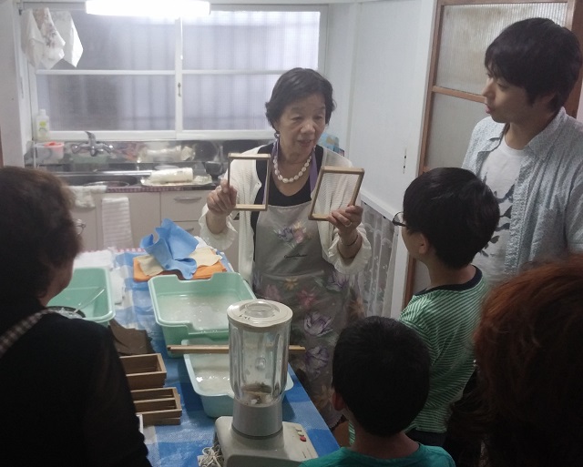 シャバ、シャバ、と2回ぐらい窪田さんが木枠を動かすと、水に浸かった白いパルプ液がすくいとられた。窪田さんが会長を務めるNPO法人文京区消費者の会では長年、牛乳パックからパルプを取り出してパルプ液を作り、紙すきの体験会などを開いてきた。8月20日、「わでか倶楽部」の小中学生が、みちこはうすにやってきて、紙すきを体験した。パルプをすくい、トンボのシールや押し花などをはさんで水を切り、アイロンで乾かしたら、完成。近所の人や消費者の会の人がアイロンを「かけたことがない」という子に教えながら、はがきやしおりが次々にできていった。「この様子は子どもたちが記事に書く予定です」と塾長の高山陽介さん。