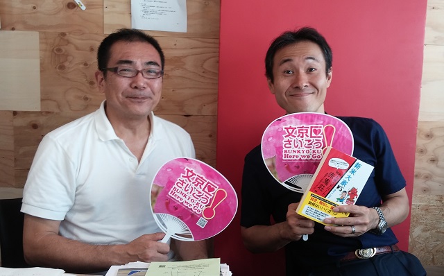 文京区の情報を集めようとしていたところ、Facebookのグループ「文京区さいこう!」に出合った。オフ会ともいえる飲み会もあるので顔を出すうちに、「うちわをつくって配ろう」という話に。賛同企業を募ってつくったうちわには、「文京区さいこう!」の下に「BUNKYO-KU Here we go」の文字。はて? Here we go=さあいこう・・・さいこう。なるほど。これを考えたのは渡辺さんだ。「おやじギャグだけど。みんなで盛り上がるのがいい。生まれついてのイベント屋なので」。在勤者として、文京区を盛り上げていきたいという。