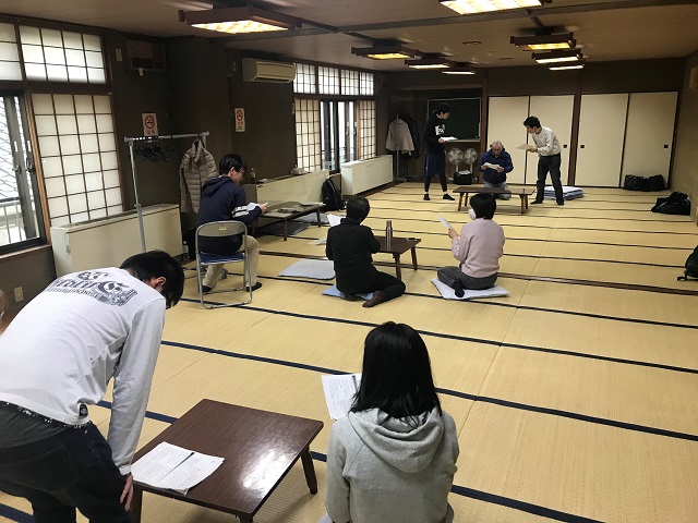いよいよ演技体験だ。この日は狂言をもとにした「弓矢太郎」という作品を練習した。2チームに分かれ、あるじ、冠者と客3人の役を演じた。腹式呼吸、腹式呼吸、と心の中で唱えながら声を出すが、せりふに気を取られ、「演技」どころではなかった。弓矢太郎が登場する前の場面をいかに密談っぽくみせるか、みんなで考えて練習し、発表。相手チームの演技を見るのも勉強になった。なんだか、身体も心もすっきりした気がする。