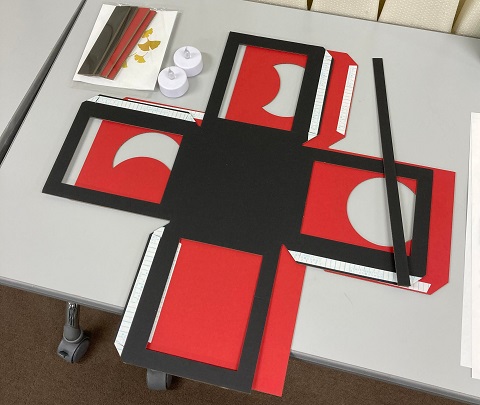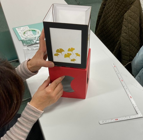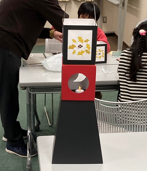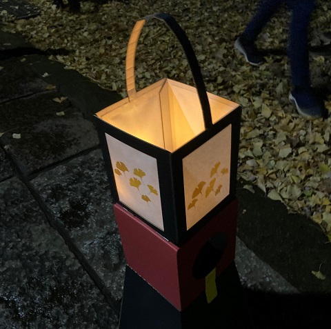 「駒込天祖神社、黄金銀杏と有明行灯」というイベントで、企画し主催したのは天祖神社の土地と隣接したところに住む、松塚昇さん。まず、16時に近くの公共施設に集まり、段ボール製のキットで有明行灯を制作。地域の親子10人ほどが集まり、思い思いに行灯に満月や三日月の窓を作り、土台と組み合わせて完成させた。