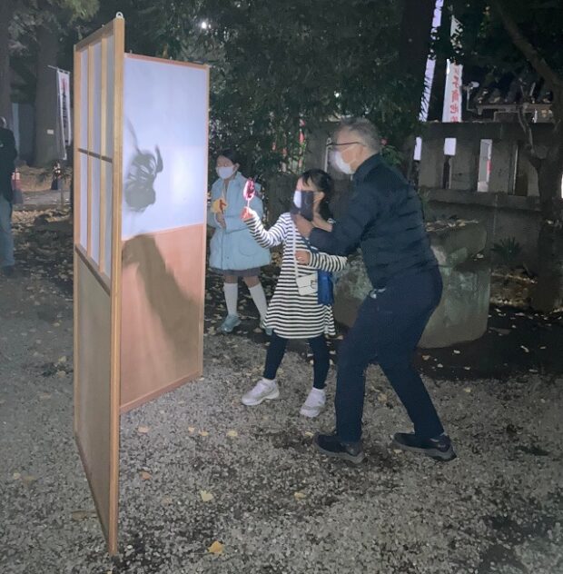 スタッフ総勢で20名ほど。さらに参道の脇前方に障子紙のスクリーンを作り、「影絵あそび」をして楽しんだ。