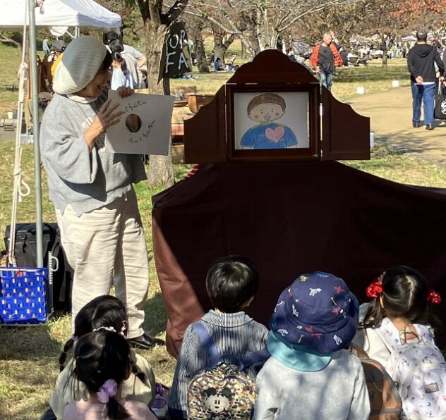 狭山公園は、西武線多摩湖駅を降りて3分。入口右手の広場では「FOOD & ハンドメイドマルシェ」を開催。広い園内を進んでいくと、「風の広場」に、たくさんのテントが点在し、木立の陰から、歌声や演奏、演技、紙芝居、ワークショップなどが次々と現れた。お互いの音を大事に、広く間隔があけられて、演奏時間もうまく組み合わされている。あちこちから親子の笑い声や拍手の音が聞こえる。だが自然のここちよい音や光が損なわれることはない。