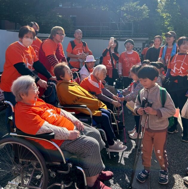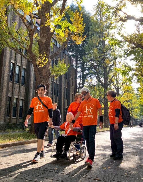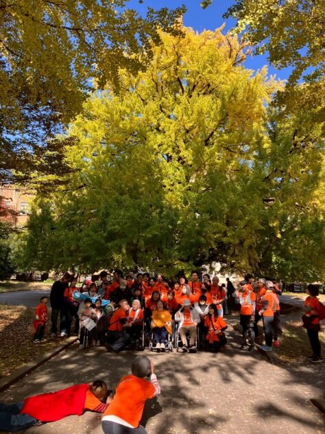 東コースは東大赤門前で、小規模多機能型施設「ユアハウス弥生」の利用者さんとスタッフ、子どもの発達支援を手がける本郷のTASUC文京の子どもたちらと合流し、東大構内をそれぞれのペースで歩いた。RUN伴は走る区間もあるが、場所によっては高齢者施設の利用者と一緒に歩く区間もある。東大構内ではまばゆいイチョウの黄葉のもと、車いすのお年寄りと子どもが自然に触れあっていた。