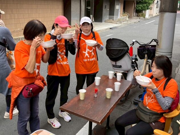 地域の居場所、動坂テラスでは、手打ちの「ビリーうどん」の提供があり、ランナーたちもひと休み。
