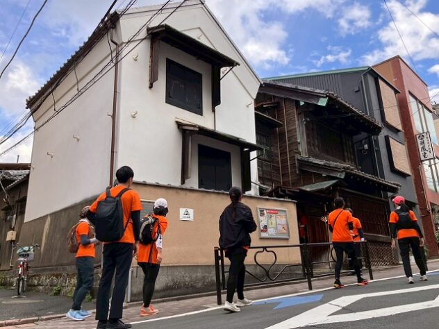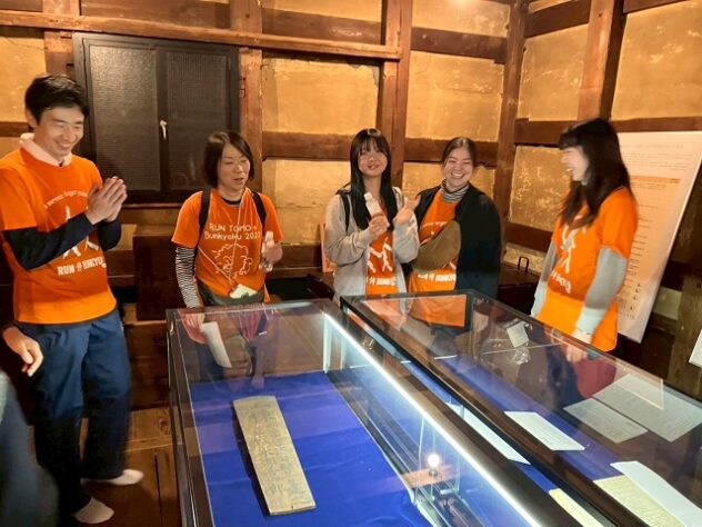 言問通りを下って到着したのは旧伊勢屋質店。明治時代に建てられた建物で、現在は跡見学園女子大学が「菊坂跡見塾」として活用している。「区民だけど入ったのは初めて」と、ランナーたちも興味津々で中に入り、学生たちの説明を受けていた。