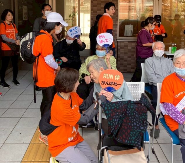 コースは2つあり、地域の居場所や高齢者施設を結び、参加者の名前が記入されたタスキをつないだ。RUN伴文京区のコンセプトは「ごちゃまぜで誰もが暮らしやすい地域をつくる」「施設と居場所をつなぐ」。多世代ごちゃまぜ、おたがいさま、が合言葉だ。スタート地点の元町ウェルネスパークでは、順天堂医院認知症疾患医療センターの専門相談員による出張相談会のほか、NPO法人地縁の輪の協力で、知的障害のある方たちによるタッチケアも体験できた。