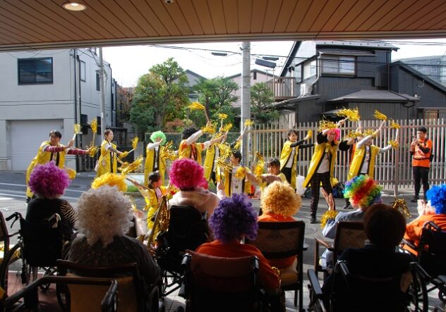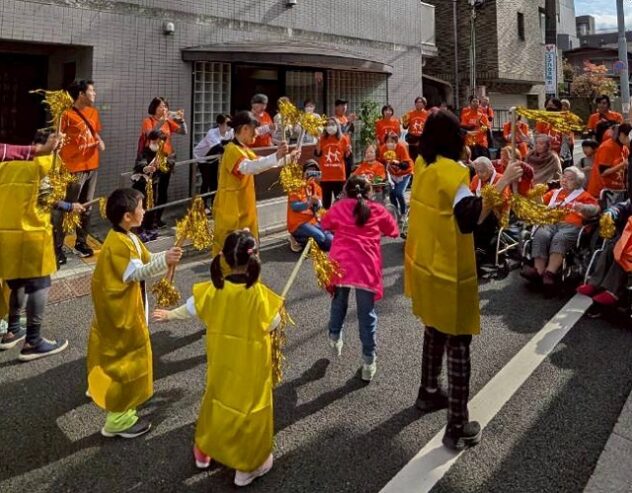 ユアハウス手前のケアギルドトーキョーでは、サンバ隊が待っていてくれた。文京区内のケアマネジャーら、医療・介護関係者や子どもたちで結成されたチームだ。