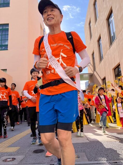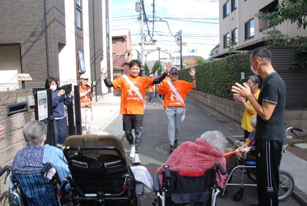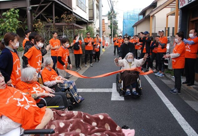次の特別養護老人ホーム「洛和ヴィラ文京春日」まで走ると、入居者がずらりと並んで待ち受けて歓待された。そこからゴールの元町ウェルネスパークまでは一走り。壱岐坂を息せき切って上り、オレンジ色のテープを切った。ランナーや拠点での応援者の名前が貼られたタスキが東コースの8拠点、西コースの14拠点を経てゴールした。