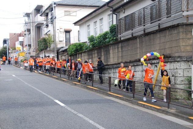 千川通りを渡った先の特別養護老人ホーム「文京くすのきの郷」では利用者さんらが出迎えた。ゆるく坂を上がって春日通りを越え小日向台地へ。有料老人ホーム「グランヴィ小日向」では、隣接するグループホーム「優っくり村」の利用者も集まっており、「必勝」「全力応援」と書かれたお手製のうちわで応援。ここでもサンバ隊の踊りが華々しく披露された。