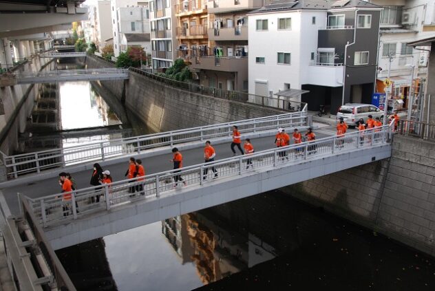 大日坂を下ると、障害児者支援の施設「リアン文京」に。ここでもサンバ隊が歌と踊りで迎えた。ここから有料老人ホーム「杜の癒しハウス文京関口」までは歩く区間。利用者さんと共に、神田川を歩いて渡り、ホームに到着した。