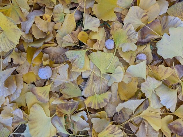 ご存知の銀杏。鼻が曲がるほど臭い。でも臭みを我慢して食べてみるとおいしい、らしい。タヌキは大好物だそうで、タヌキのトイレ場には消化されずそのまま出てきた固い殻に包まれた銀杏が積もっていた。
