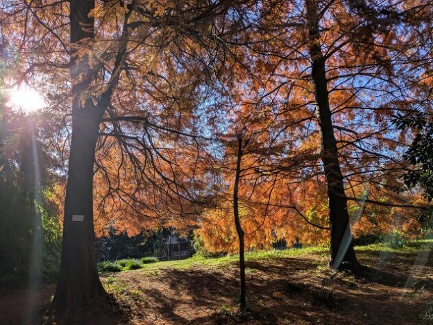 落葉針葉樹ラクウショウの黄葉。米国東部に分布し、沼の近くに生えるスギ、沼杉の別名もあるそうだ。紅葉は逆光で撮影すると美しい。14時、15時ごろ日が傾くころが撮り時だが、日が傾くと急に寒くなるので防寒は必須。