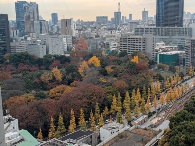 シビックセンターの上階から、小石川後楽園の紅葉が見下ろせた。通り沿いのイチョウが黄色いクリスマスツリーのよう。クリスマスもあっという間に来て、お正月も早いのだろうな。(稲葉洋子、敬)
