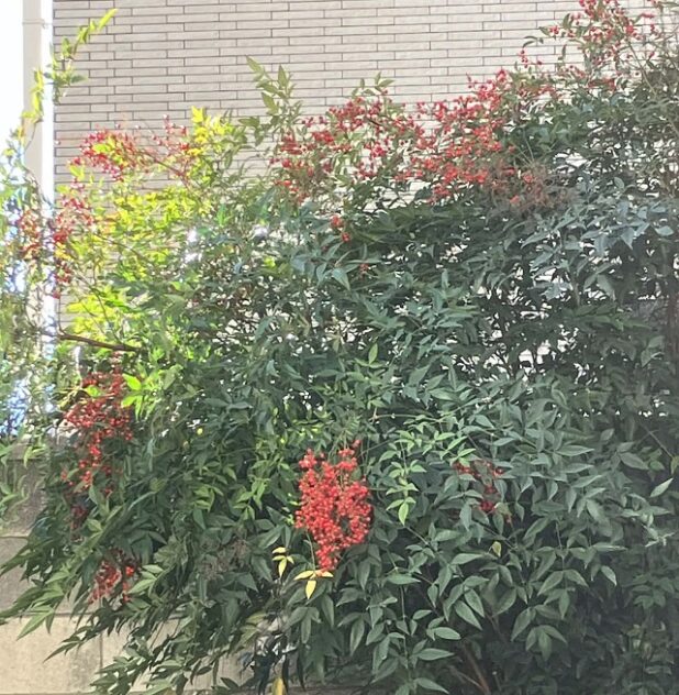 立派な庭園でなくても、ご近所のお庭だって実がたくさんなっている。南天が見ごろだ。