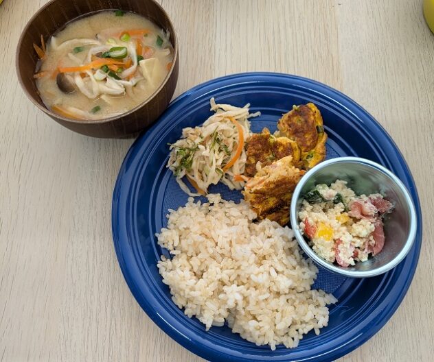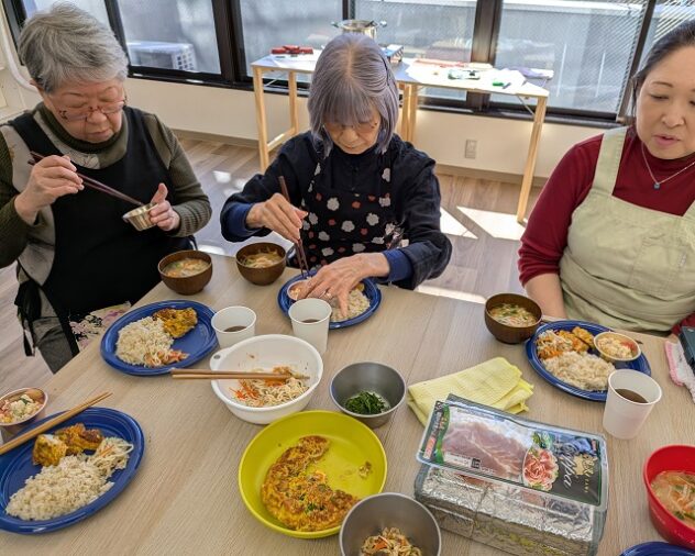 この日のメニューは、切り干し大根の梅あえ、オムレツ、みそ汁。参加者で分担して切り干し大根を水で戻し、ニンジンを千切りし、シメジをほぐし、卵を割り、と作業した。梅あえは、戻した切り干し大根と、さっとゆでた千切りニンジン、千切りにしたシソの葉、青ネギを合わせ、刻んでたたいた梅干しとしょうゆ、砂糖、ごま油少々であえるだけ。さっぱりして梅シソの香り高い一品だ。