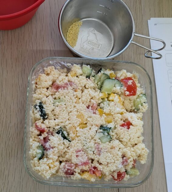 「こちらはヨーグルトで戻したクスクスです」。クスクスはアフリカ発祥で、小麦から作る粒状のパスタ。世界最小のパスタとも言われるそうだ。お湯で戻すのが一般的だが、クスクスの倍の分量のヨーグルトに一晩つけておき、角切りにしたキュウリ、ミニトマト、パプリカや、塩味として生ハムを加え、フレンチドレッシングをかけるとカラフルなサラダに。ヨーグルトで戻したクスクスはチーズのような風味で、ワインに合いそうだ。クスクスをトマトジュースで戻してグリルした鶏肉に添えてもおいしいそうだ。