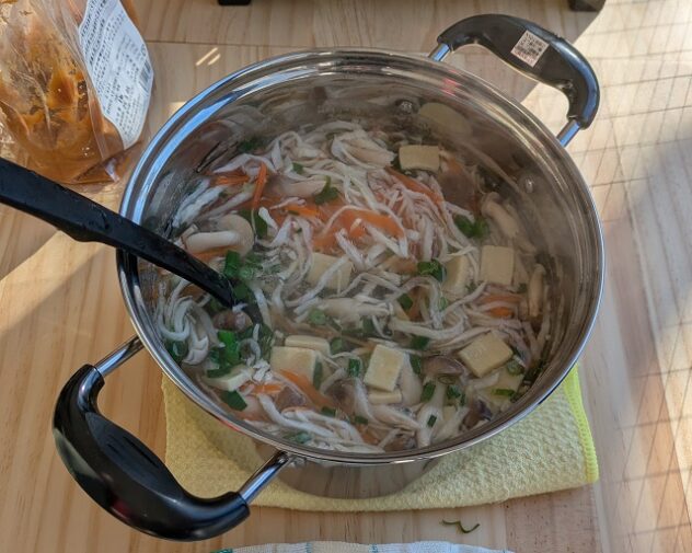 みそ汁には切り干し大根とニンジン、シメジのほか、薄切り高野豆腐を入れた。「薄切り高野豆腐はそのまま汁に入れられて便利。この辺だと播磨坂の上のスーパーで買えます」とのこと。