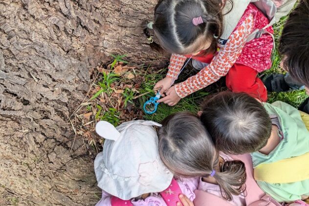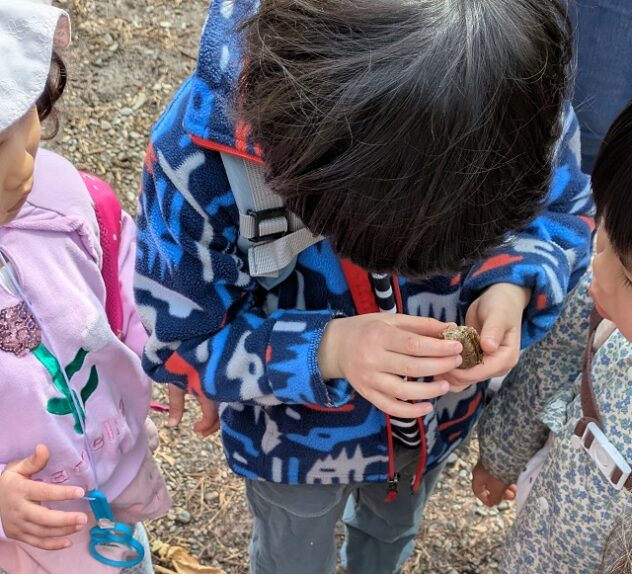 「これなにかなぁ。カマキリの卵かなぁ」。黄土色の塊を虫眼鏡で見たり、手に取ってむいてみたり。