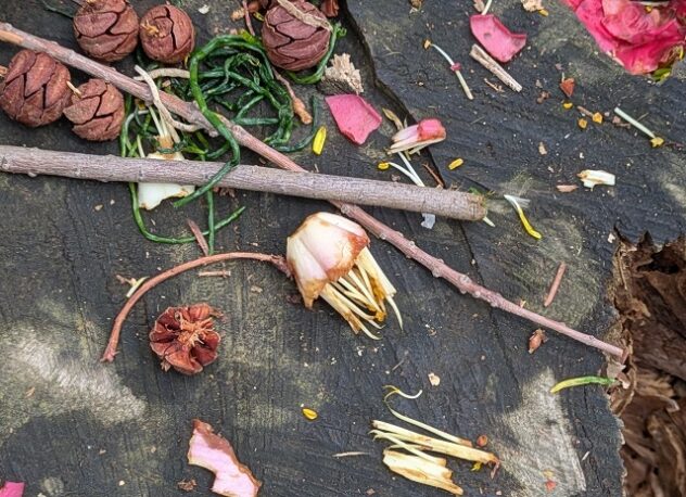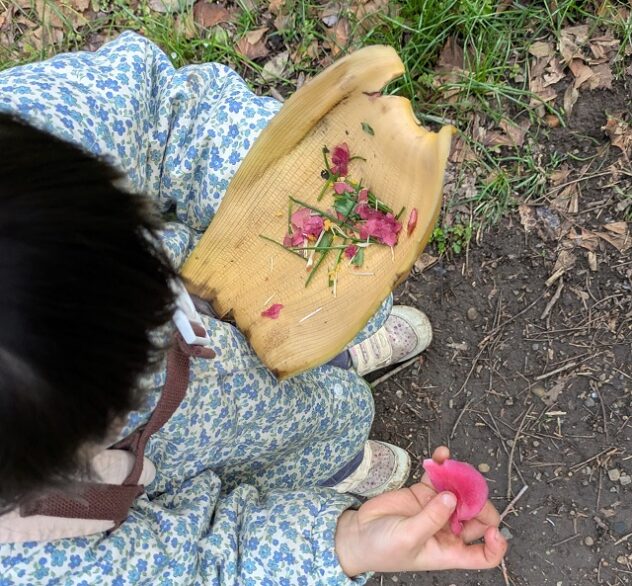 バショウの花を覆う苞(ほう)を拾った子は、草の葉やツバキの花びら、桜の花びらを集めて入れて「スープをつくるの」。