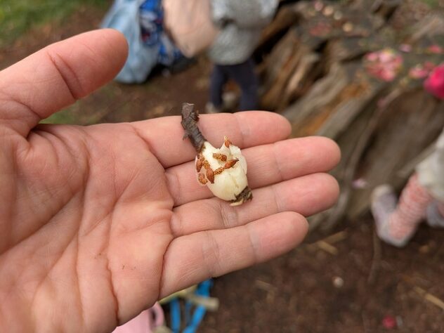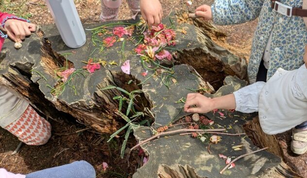 「あ、これ玉ねぎみたい」。地面に落ちていた球根のようなものを、1人がむき始めると、他の子もまねしてむき始めた。そして、お寿司屋さんがいつの間にか、和菓子屋さんになったようだ。「あんころもちをつくりまーす」。白くむかれた球根をたたいてつぶし、「お米」をふりかけ、「はい、あんころもちでーす」。