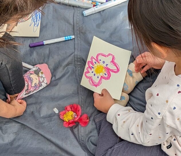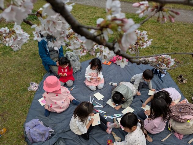 桜の広場に着いたのは、13時過ぎ。小さい子はちょっと疲れてふらふらしていたが、敷物を広げてお絵かきが始まるとたちまち元気に。ツバキの花にタンポポや桜の花びらを加えて「王子の冠」を作った子は、その絵を描いていた。