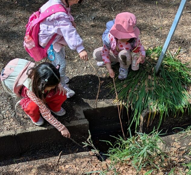溝にたまった水のそばにしゃがみ込み、棒をたらして「釣り」も始まった。「あ、釣れた!」と枯れ葉が棒に刺さると喜ぶ。落ちていた長いツルは電車ごっこのツールに。