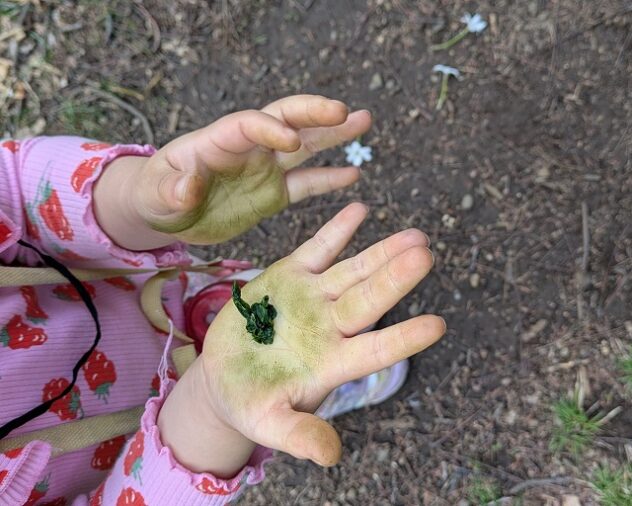 他の子もマネして手で葉っぱをコネコネ。「わー、手が緑になっちゃったー」。