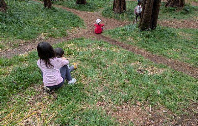 桜のきれいな場所に行ってお花見をしたい、という大人の思いなど気にもかけず、落葉針葉樹の林の中ではお寿司屋、和菓子屋が繁盛していた。そのうち、「すべり台!」と草をすべり始める子もいる。ひとしきり遊んで、林の隅の陽だまりでお昼ごはん。日差しが暑いぐらいで、そよ風が心地よい。
